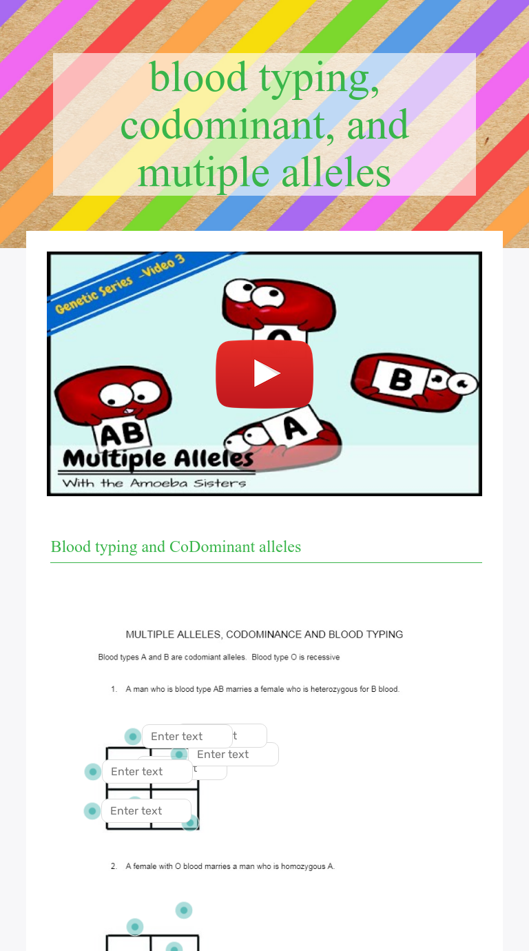 Multiple alleles (abo blood types) and punnett squares Multiple alleles alleles are alternative forms of a gene, and they are responsible for differences in phenotypic expression of a given trait (e.g instances in which a particular gene may exist in three or more allelic forms are known as multiple allele conditions. Amobea sister multiple alleles worksheet. Learn how to set up and solve a genetic problem involving multiple alleles using abo blood types as an example! Join the amoeba sisters as they discuss the terms gene and allele in context of a gene involved in ptc (phenylthiocarbamide).